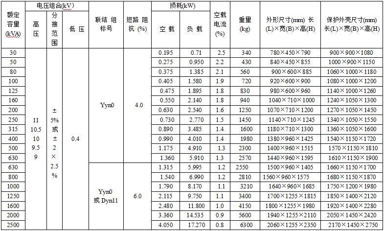 10kV級干式變壓器SCB10系列技術(shù)參數